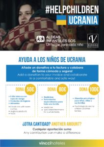 'Nalysnyky' y 'Varejuna', plato y bebida ucranianos en Beach Cluub Estrella del Mar.Por supuesto, la cadena hotelera también hace un llamamiento para continuar ayudando a los niños y niñas que lo necesitan en nuestro país. En el marco de su política de Responsabilidad Social Corporativa, Vincci Hoteles mantiene un acuerdo de colaboración con Aldeas Infantiles SOS desde el año 2015. Como parte del mismo, los huéspedes de Vincci Hoteles en España tienen la posibilidad de forma permanente de realizar una donación de 1 euro en el momento del checkout, a su salida del alojamiento, que va destinado a los programas de protección que se lleva a cabo en las distintas Aldeas repartidas por toda la geografía española. Además, la cadena pone a disposición de sus clientes los Menús Eventos Solidarios, en los que parte del coste va destinado a la organización. La compañía también está implicada en los proyectos de voluntariado social y corporativo de la organización y en programas de formación a jóvenes de Aldeas, con la posibilidad de incorporaciones futuras en el mercado laboral. Asimismo, destina mensualmente la recaudación por redondeo de la nómina de todos los empleados a Aldeas Infantiles SOS.