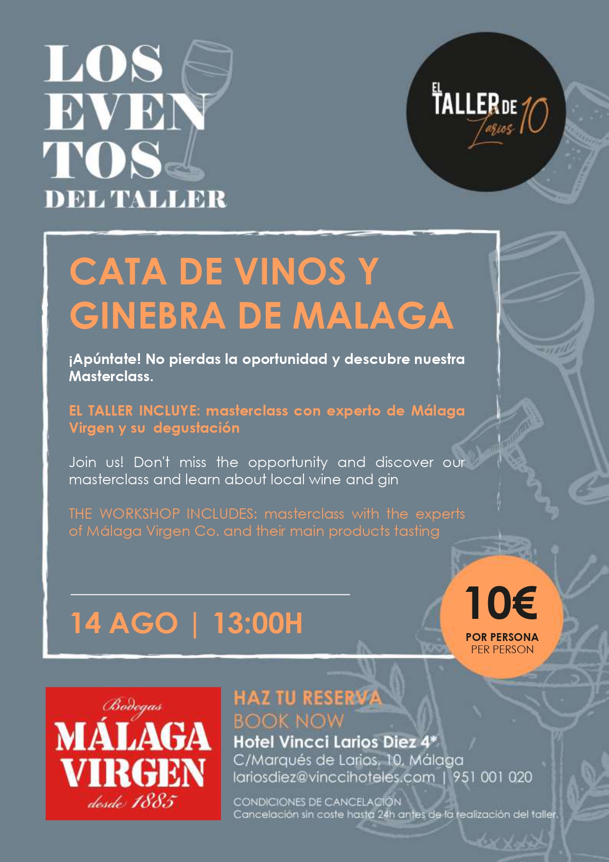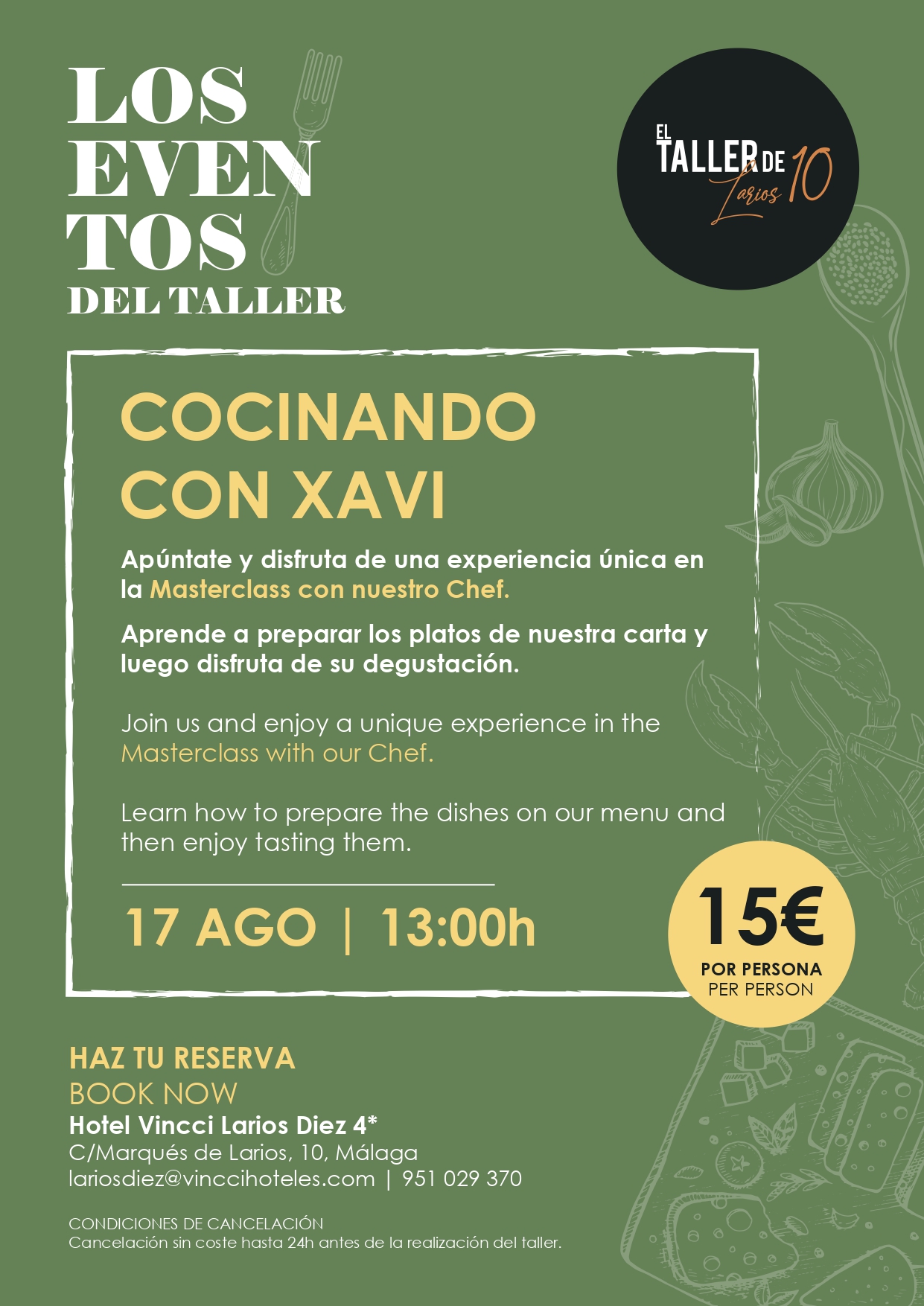 Cata de vinos y ginebra en el restaurante El Taller de Larios 10Los “cocinillas” además están de enhorabuena porque el día 17 de agostoa las 13.00h podrán ponerse manos a la obra en la masterclass “Cocinando con Xavi”, una exclusiva clase magistral con el chef de “El Taller de Larios 10”.