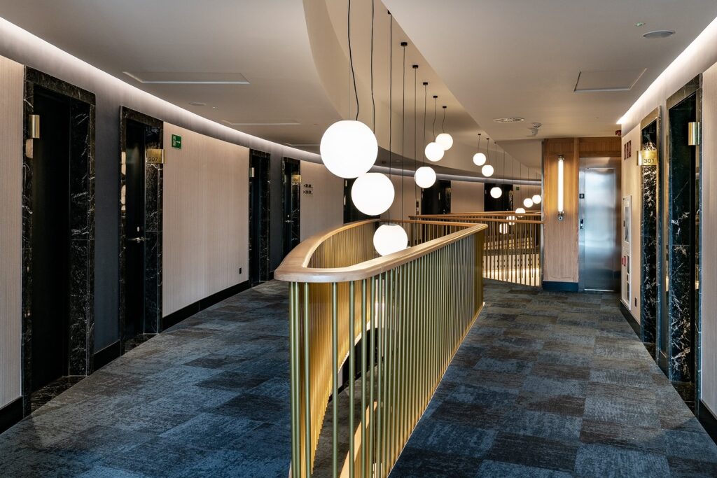 Las habitaciones se sitúan en las 3 plantas superiores junto con un atrio de gran altura que configura un interesante espacio central de comunicación entre las mismas.