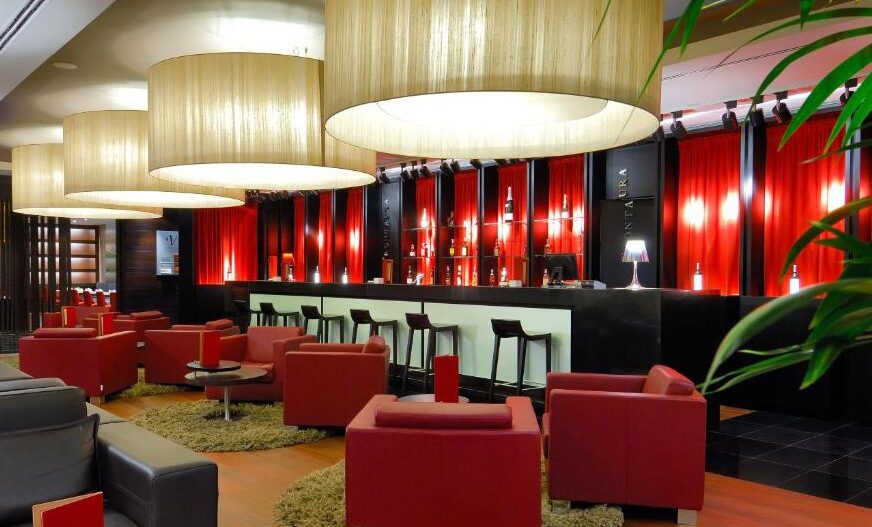 Miraponte Bar en Vincci Ponte de Ferro 4*Está compuesta por su lobby bar “Miraponte Bar”, un lugar para relajarse después de un día ajetreado con las mejores vistas sobre el Duero; su “Adega Wine Bar”, un espacio dedicado al culto al vino en el que degustar las ricas referencias de la zona y su restaurante a la carta “Ponte de Ferro Restaurante”, el lugar donde las explosiones de sabores se mezclan con el interiorismo más exquisito y las mejores vistas.