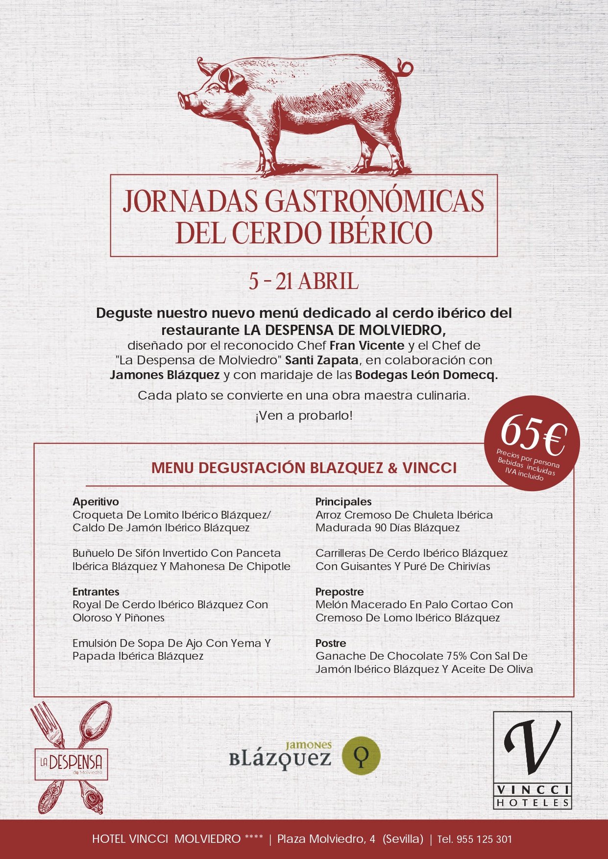 Vincci Molviedro 4* (Plaza de Molviedro 4, Sevilla) recibe a la feria sevillana con distintas citas ineludibles. Del 4 al 21 de abril, su restaurante La Despensa de Molviedro acoge las “Jornadas Gastronómicas del Cerdo Ibérico” ofreciendo tanto a huéspedes como a público en general la oportunidad de disfrutar un menú degustación dedicado al cerdo ibérico, diseñado por el reconocido Chef Fran Vicente (concursante de Top Chef) y el Chef de La Despensa de Molviedro, Santi Zapata, en colaboración con Jamones Blázquez. Ambos cocineros suman fuerzas para crear una deliciosa propuesta que incluye aperitivo, dos entrantes, dos platos principales, un pre postre y un postre, un auténtico festín para concederse un verdadero homenaje durante estos días (65€ por persona, bebidas incluidas).