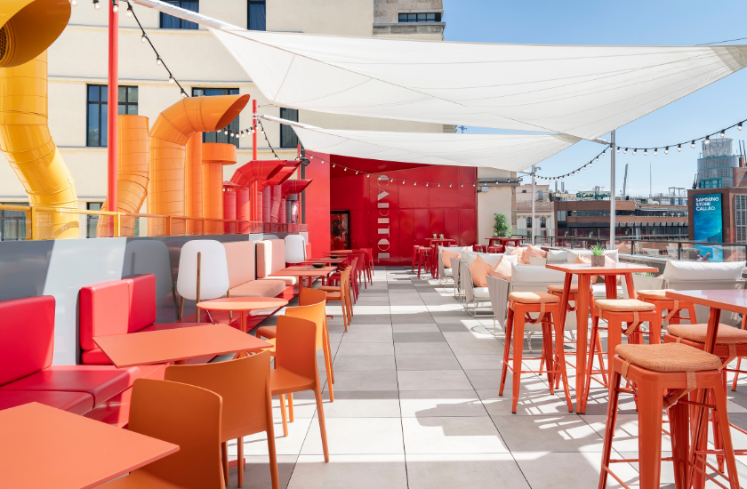 Capitol Rooftop en Vincci Capitol 4*De Madrid al Cielo dice el refranero popular castizo que no habla, sin embargo, de la belleza de la capital al observarla desde las alturas. Y qué mejor que hacerlo desde uno de los emblemas de la Gran Vía y de la capital: el icónico Vincci Capitol 4* con su cartel de neones de colores presidiendo la plaza de Callao. La terraza de la planta 7 de Vincci Capitol 4* permite divisar el Madrid de los Austrias en todo su esplendor. El CapitolRooftop es un espacio mágico al aire libre con un diseño firmado por la prestigiosa arquitecta e interiorista Teresa Sapey que incluye originales “chimeneas” típicas de azotea, pero en distintos tonos luminosos, de una gama cromática que evoca los colores del atardecer, desde el amarillo, pasando por el naranja y llegando al rojo. La interiorista muestra un atardecer con colores brillantes que transmite alegría y un ambiente agradable durante las horas de luz y también en el ocaso, acompañado de una tenue iluminación.